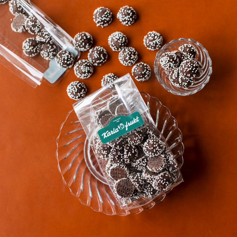 En riktig konfektyrklassiker. Fylld med söt punschsmak, täckt av choklad. Karla frukts cellofanpåse med punschpraliner är fylld med små munsbitar av tradition och njutning, lika älskade nu som då. Med sin karaktäristiska arom och lätt vuxna smak är de självklara till kaffet, som ”gå bort”-present eller när du vill unna dig något med en air av nostalgi. Visste du att punschpralinen blev populär i Sverige redan i början av 1900-talet, inspirerad av tidens kärlek till den söta arrakspunschen? Packad i cellofanpåse med omsorg i vår butik på Karlavägen. Återförslutningsbar tack vare etiketten.