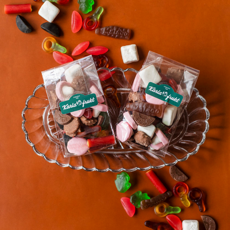 | Innehåll | Socker, karamelliserat socker, glukossirap, fruktossirap, invertsockersirap, gelatin, stärkelse (modifierad majs, majs och potatis), vatten, vegetabiliska oljor (kokos, raps), druvsocker, arom (bl.a. vanillin, naturlig arom, anis), fuktighetsbevarande medel (sorbitol, glycerol), surhetsreglerande ämne (citronsyra, äppelsyra), vegetabilisk olja (kokosolja, rapsolja, solrosolja), ytbehandlingsmedel (karnaubavax, bivax vitt och gult), stabiliseringsmedel (agar), förtjockningsmedel (arabisk gummi), emulgeringsmedel (mono- och diglycerider av fettsyror), vegetabiliskt fett (palm, kokos, shea), antioxidant (askorbinsyra), kakaosmör/pulver/massa, kokosflingor, salt, kelse, frukt- och plantkoncentrat (spirulina, safflor, äpple, citron, rättika, sötpotatis, morot, svarta vinbär, hibiskus), färgämnen (E 120, karmin, kurkumin, vegetabiliskt kol, briljantblått fcf, karotener, sockerkulör). Cocosprickar och Romerska bågar innehåller bl.a. emulgeringsmedel (sojalecetin) och vasslepulver (mjölk), helmjölkspulver. Rabarberbi |