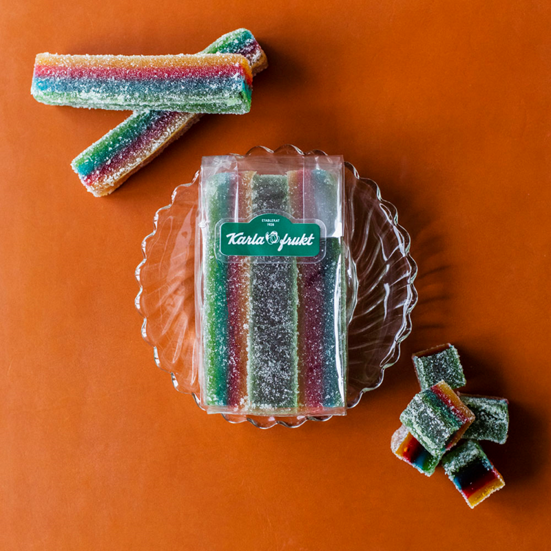 Saftiga, mjuka och fantastiskt goda marmeladstänger. Svenskt konfektyrhantverk när det är som bäst. De kokas långsamt över öppen låga i kopparkärl, där fruktsmaken får utvecklas till sin fulla sötma. När marmeladen nått precis rätt temperatur hälls den ut, får stelna och skärs sedan för hand innan varje stång rullas i socker. Tillverkade i Skåne enligt traditionell metod. Resultatet? Ett färgstarkt hantverk med härligt seg konsistens och frisk, fruktig smak.