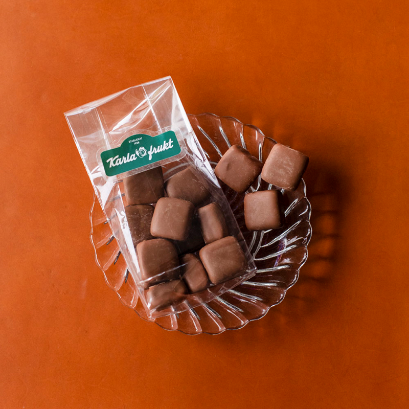 Klassiker som trogna Karla frukt-kunder minns från förr i tiden, som vi åter tagit i produktion. Våra egna Karla-rutor med fluffig, vit skumfyllning, doppade i ett generöst lager ljus, belgisk choklad. Mjuka, fluffiga, sega och söta. En oemotståndlig kombination av fluffig ”sockerbit” inuti och len choklad utanpå. En utsökt favorit som för tankarna till gamla tiders karamellbutiker. Tillverkas hos ett familjeföretag utanför Stockholm.