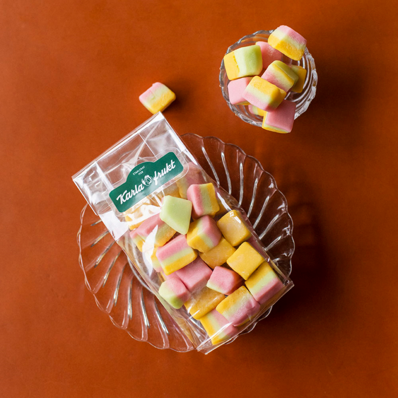 Handgjord konfekt. Små, handskurna bitar av mjuk marsipan i lager av rosa, vitt, gult och grönt. Lika underbart fina att se på som goda att äta! En älskad klassiker med vacker färgprakt och mild, fin marsipansmak. Godis med anor från sekelskiftets festliga kvällar på teatern eller operan förr i tiden (teaterkonfekt ansågs finare än karameller). Perfekt till kaffet, till gottebordet, som gåva till en finsmakare eller bara när du vill unna dig något riktigt (riktigt) gott.Packad med omsorg i vår butik på Karlavägen, i cellofanpåse som är återförslutningsbar tack vare etiketten.
