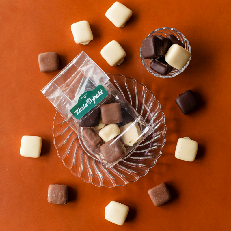 Klassiker som trogna Karla frukt-kunder minns från förr i tiden, som vi åter tagit i produktion. Våra egna Karla-rutor. Mjuka, fluffiga, sega och söta, doppade i fin belgisk choklad. En oemotståndlig kombination av fluffig ”sockerbit” inuti och len choklad utanpå. I varje påse hittar du en mix av Karla-rutor med mörk choklad, ljus mjölkchoklad och vit choklad (de vita Karla-rutorna smakar jordgubb). En utsökt favorit som för tankarna till gamla tiders karamellbutiker. Tillverkas hos ett familjeföretag utanför Stockholm.
