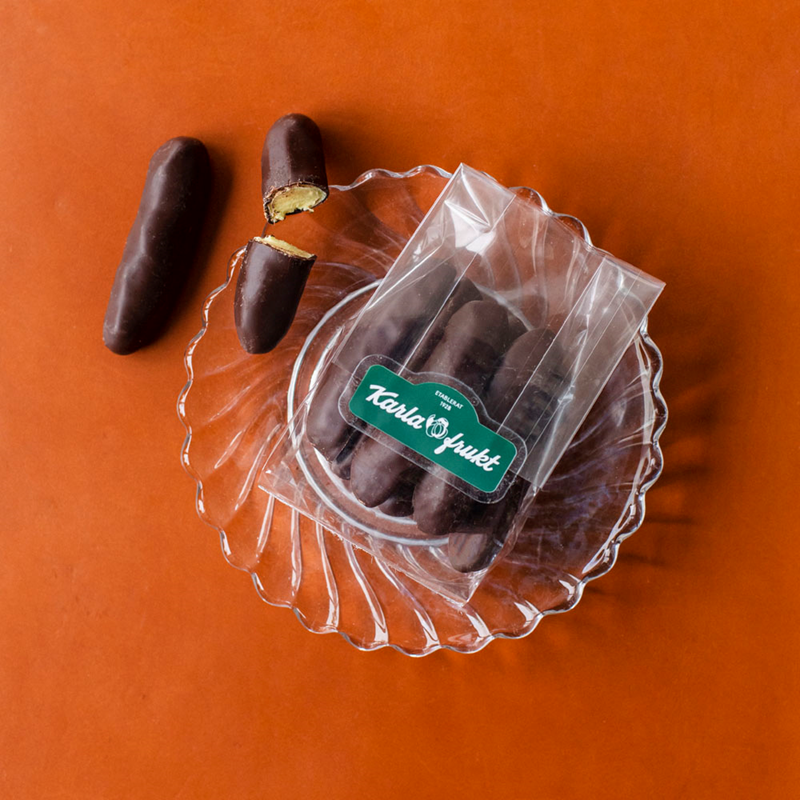 Våra egna skumbananer, en riktig Karla frukt-favorit. Mjuka, luftiga skumbananer som doppas i ett rejält lager fin, mörk belgisk choklad. En perfekt balans mellan lent skum med smak av solmogen banan och täcket av choklad. Försvinnande goda. Lekfullt lyxigt för dig som älskar klassikern men vill ha det lilla extra. Våra stammisar återkommer alltid till Karla-bananerna - du kommer förstå varför!