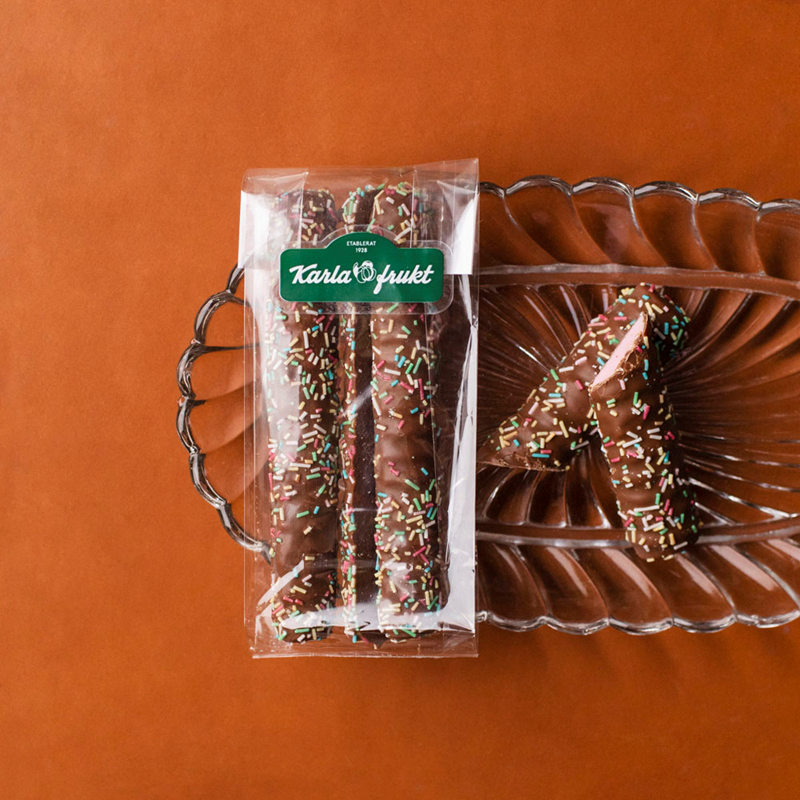 Stänger med seg-luftigt skum med härligt söt smak av jordgubb och sedan färgsprakande strössel ovanpå. Succé! En godisikon från förr (vem minns inte en klassisk krokofant, de sega stängerna doppade i mjölkchoklad? Kärt barn har många namn) i ny tappning. En storsäljare hos oss på Karla frukt, tillverkad med omsorg hos Franssons konfektyrer i svenska godismeckat Gränna.