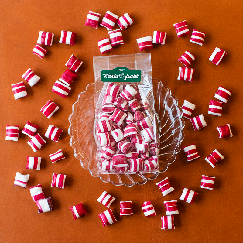 Polkagrisar med klassisk pepparmint, kokade i Gränna såklart. Rödvita karamellerna tillverkas på traditionellt vis, med naturlig pepparmyntsolja. Resultatet är krispiga, vackra godisbitar som långsamt smälter i munnen. Den perfekta balansen mellan sötma, krisp och frisk mint.