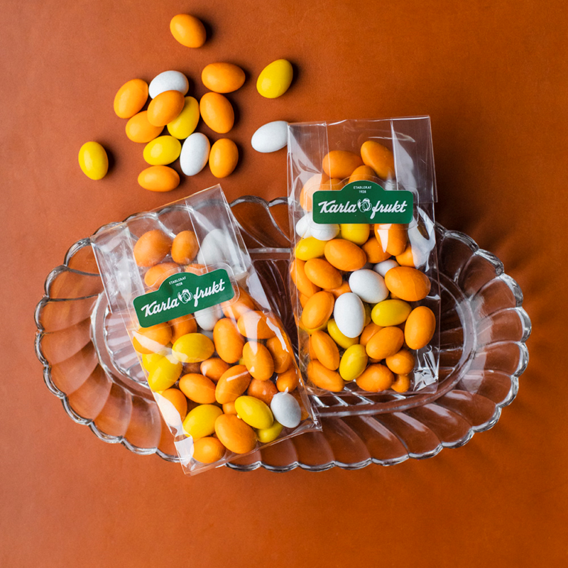 Exklusiva mandelägg från danska hovleverantören Anthon Berg. Rostad mandel i mitten, omslutna av len choklad, täckte med ett krispigt sockerskal. Anthon Berg grundades i Köpenhamn 1884 och är ett av Nordens mest anrika chokladhus. De vackra äggen i vitt, orange och gult smakar av en elegant balans mellan krispig mandel och mjuk choklad. Packade med omsorg i vår butik på Karlavägen, i återförslutningsbar cellofanpåse.